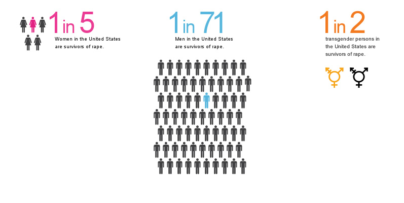 According to the 2010 National Intimate Partner and Sexual Violence Survey (NISVS) Summary Report, lifetime prevalence of rape among women is 18.3%, among men is 1.4% and among transgender individuals is 50%. This means in 2010, 31.2 million people in the United States were survivors of rape. Check out our Preventions That Work section to find out what you can do to STOP THE VIOLENCE.